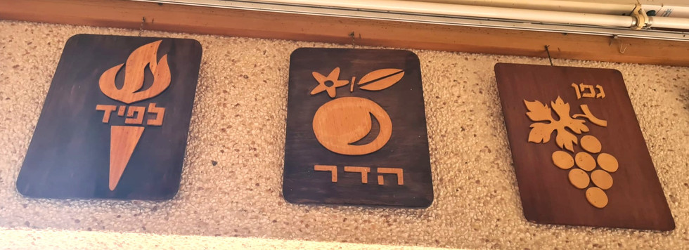 בקיבוץ כפר גלעדי נוהגים כבר עשרות בשנים לעצב בעץ את סמל הקבוצה, וכל הסמלים מעטרים את חדר האוכל של הקיבוץ. הינה כמה מהם;