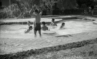 גלוית ברָכָה לשנה החדשה (שנות ה־70); טקס חנוכת הגן: בני קבוצת "מצדה" קופצים לבְּרֵֵכָה.