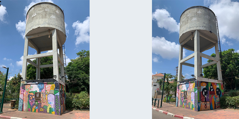 לא רחוק מן הקיר הזה בפארק רעננה עצרתי ליד אחד ממגדלי המים הישנים של המושבה. מגדל זה שוּמר ועוטר בציורי קיר.
